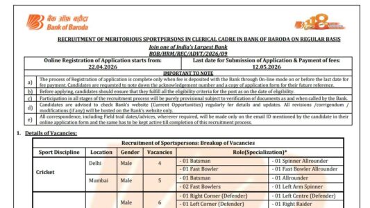 About Post- Bank of Baroda (BOB) has officially released the recruitment notification for Meritorious Sportspersons in Clerical Cadre (Customer Service Associate) on a regular basis for the year 2026. Talented sportspersons in Cricket, Kabaddi, Table Tennis, and Football can apply online from 22-04-2026 to 12-05-2026.