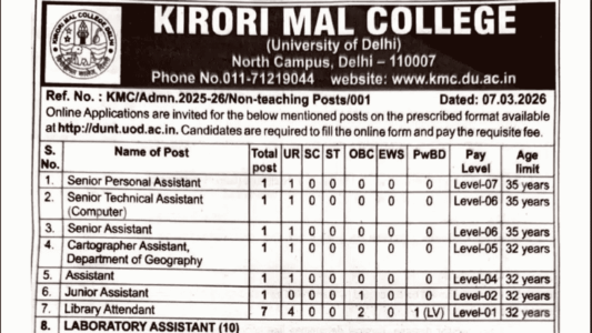 About Post- Kirori Mal College (KMC), University of Delhi has released an Official Short Notification for 57 Non-Teaching Posts 2026. Eligible to apply online at dunt.uod.ac.in. Vacancies include Senior Personal Assistant, Senior Technical Assistant (Computer), Senior Assistant, Cartographer Assistant, Laboratory Assistant, Laboratory Attendant and more. The last date to submit the online application is 27-03-2026.