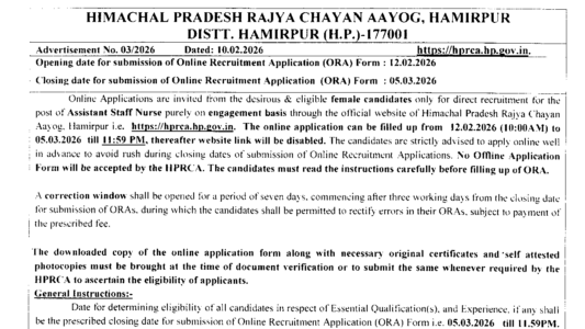 About Post- Himachal Pradesh Rajya Chayan Aayog (HPRCA Staff Nurse Recruitment 2026), Hamirpur has released Advertisement No. 03/2026 dated 10-02-2026 for recruitment of Assistant Staff Nurse (Allopathy) purely on Engagement Basis. Total 390 vacancies available. Fixed monthly honorarium: Rs. 25,000/- for period of 5 years. Only Female Candidates can apply. Candidate Must Read Official Notification For More Details. HP Assistant Staff Nurse Vacancy Notification 2026 Shorts Details: Apply Now