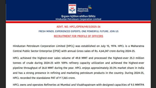 About Post – Hindustan Petroleum Corporation Limited ( HPCL ),  A Maharatna Central Public Sector Enterprise (CPSE), has released Advt. No. HPCL /OPEN /HR/3 /2025-26 for Recruitment of Officers and Junior Executives across various disciplines. This is a golden opportunity for both freshers and experienced professionals to join one of India’s most prestigious oil and gas companies. Total vacancies are across Engineering, Finance, HR, IS, Fire & Safety and many more profiles. Eligible candidates can apply online from 25th February 2026. Candidate Should read official notification for more details.