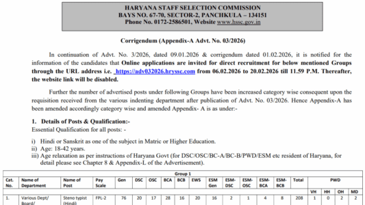 About Post- The Haryana Staff Selection Commission (HSSC Group C Stenographer Recruitment Notification 2026) has released Advertisement No. 03/2026 for recruitment to Group-C (Steno) Posts through Common Eligibility Test (CET) Phase-II. Total 1953 posts are available across various categories including Steno-Typist (Hindi), Steno-Typist (English), Junior Scale Stenographer, Senior Scale Stenographer in both languages for Various Departments / Boards / Corporations. Eligible candidate must read official notification for more details.