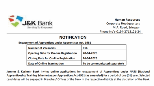 About Post- Jammu & Kashmir Bank Limited has released Notification (Ref. No. JKB/HR/Rectt/2026-182) for engagement of 614 Apprentices under NATS (National Apprenticeship Training Scheme) as per Apprentices Act, 1961. Apprenticeship duration is 12 months. No permanent employment is guaranteed. Candidates must first register on NATS Portal (nats.education.gov.in) before applying. Online applications open from 20-04-2026 to 26-04-2026.