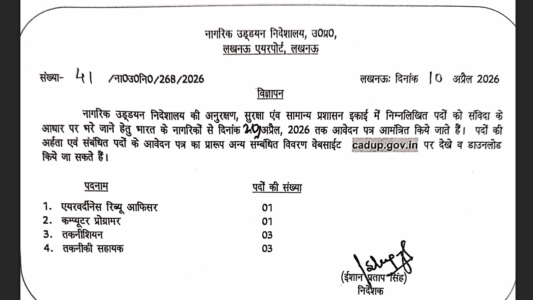 About Post- The Directorate of Civil Aviation, Uttar Pradesh has released an official advertisement for 08 contractual posts at Lucknow Airport including Airworthiness Review Officer, Computer Programmer, Technician, and Technical Assistant. Candidates possessing Engineering Degree /Diploma /ITI with relevant aviation experience can apply offline by sending their applications via Registered/Speed Post to the office of the Director, Civil Aviation, U.P., Lucknow Airport, Lucknow-226009 on or before 29-04-2026.