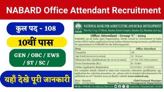 | National Bank for Agriculture and Rural Development (NABARD) ने NABARD Office Attendant पद की भर्ती के लिए कुल 180 पदों पर भर्ती निकाली है। इस पोस्ट से सम्बंधित जानकारी आपको इस आर्टिकल में विस्तारपूर्वक मिलेगी।