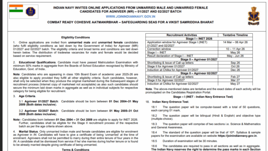 About Post- The Directorate of Manpower Planning & Recruitment, Naval Headquarters New Delhi has released the official notification for Indian Navy Agniveer (MR) and Agniveer (SSR) 01/2027 and 02/2027 Batch Recruitment 2026. Eligible unmarried Male and Female candidates from all over India can apply online from 14-03-2026 to 06-04-2026 on the official website joinindiannavy.gov.in. Agniveers will serve for 4 years with a monthly package starting from Rs. 30,000/-. Up to 25% of each batch may be offered permanent enrolment as Sailor (Regular Cadre) in the Indian Navy after 4 years of service.
