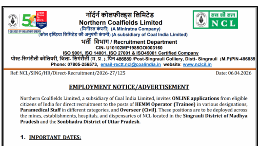 About Post- Northern Coalfields Limited (NCL), a subsidiary of Coal India Limited, has officially released a recruitment notification on 06-04-2026 for 577 tentative vacancies across HEMM Operator (Trainee), Paramedical Staff, and Overseer (Civil) posts. The online application window opens on 09-04-2026 and closes on 01-05-2026. Selection will be through a Computer-Based Test (CBT) followed by Document Verification. Selected candidates will be posted at NCL facilities in Singrauli (M.P.) or Sonbhadra (U.P.) and may be transferred to other CIL subsidiaries.
