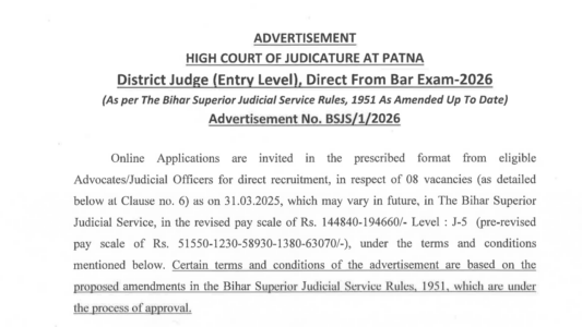 About Post- The High Court of Judicature at Patna has released Advertisement No. BSJS/1/2026 for direct recruitment to the post of District Judge (Entry Level) in the Bihar Superior Judicial Service. A total of 08 vacancies are available including current and backlog vacancies for the years 2020-21, 2021-22, 2022-23, 2023-24 and 2024-25. Eligible Advocates / Judicial Officers with 7 or more years of continuous practice can apply online from 16-04-2026 to 15-05-2026 through the official website of Patna High Court.