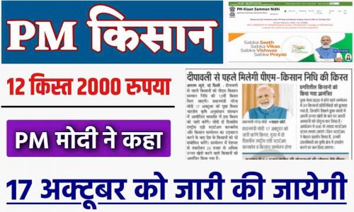 - केंद्र सरकार द्धारा जारी न्यू अपट के अनुसार, दिपावली के पावन त्यौहार से पहले ही केंद्र सरकार देश के सभी किसानो को पी.एम किसान योजना की 12वीं किस्त का 2,000 रुपया देगी और