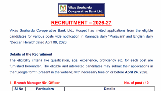About Post- Vikas Souharda Co-operative Bank Ltd., Hospet has invited applications from eligible candidates for various posts for the year 2026-27. Eligible and interested candidates can submit their application through the Google Form available on the official website along with the application fee on or before 24-04-2026.